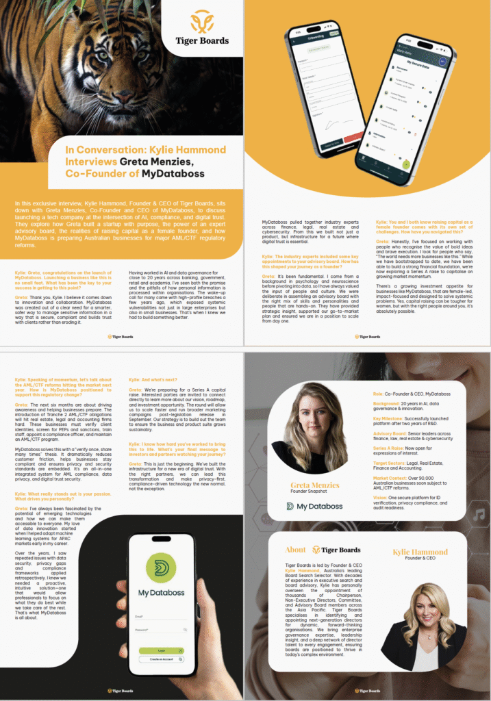 Led by Kylie Hammond, Tiger Boards is Australia’s premier Board Search firm. We specialise in appointing next-generation directors and advisory board members for dynamic organisations navigating change. With a deep network across the Asia Pacific and decades of experience in executive search, Tiger Boards helps shape boards of the future. www.tigerboards.com.au